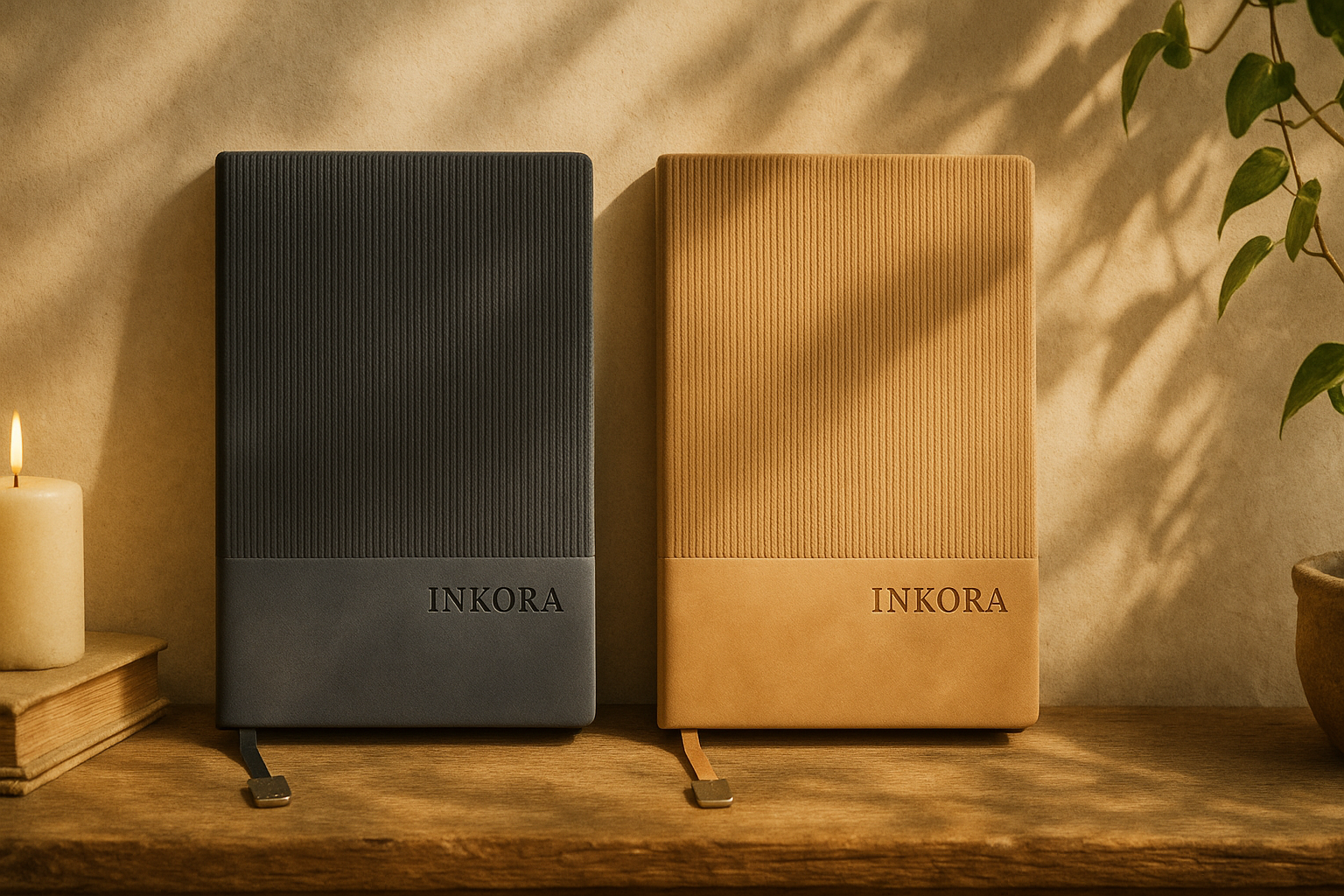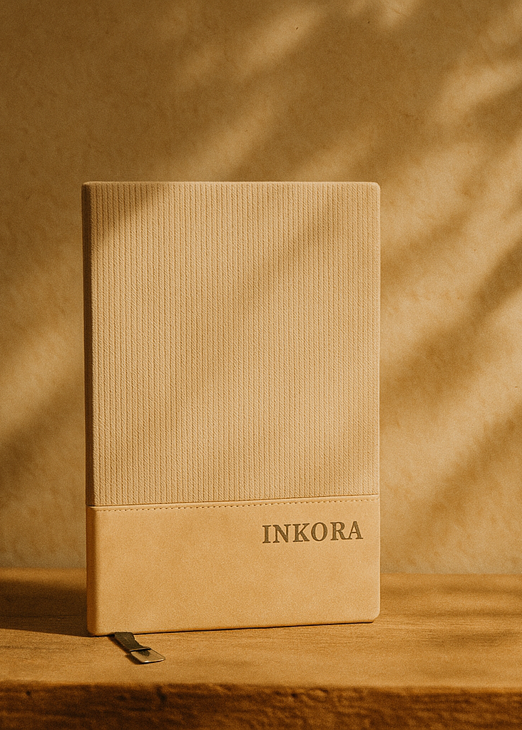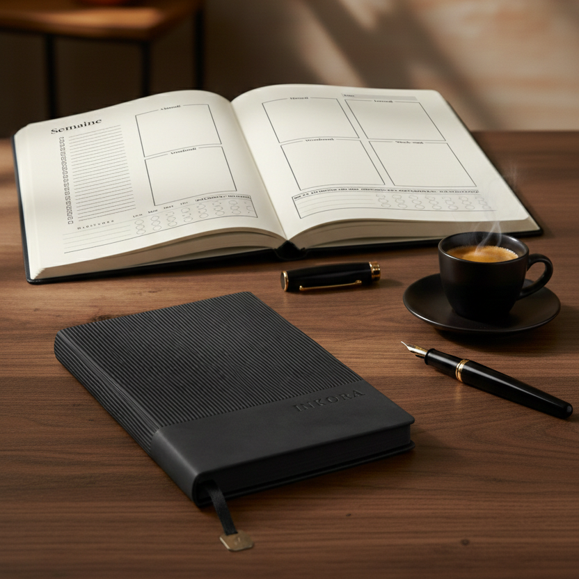 Couverture en cuir vegan texturé, reliure cousue, papier 90g et ouverture lay-flat à 180° pour écrire sans contrainte. Chaque planner Inkora est pensé comme un objet d'exception conçu pour durer et vous accompagner partout.